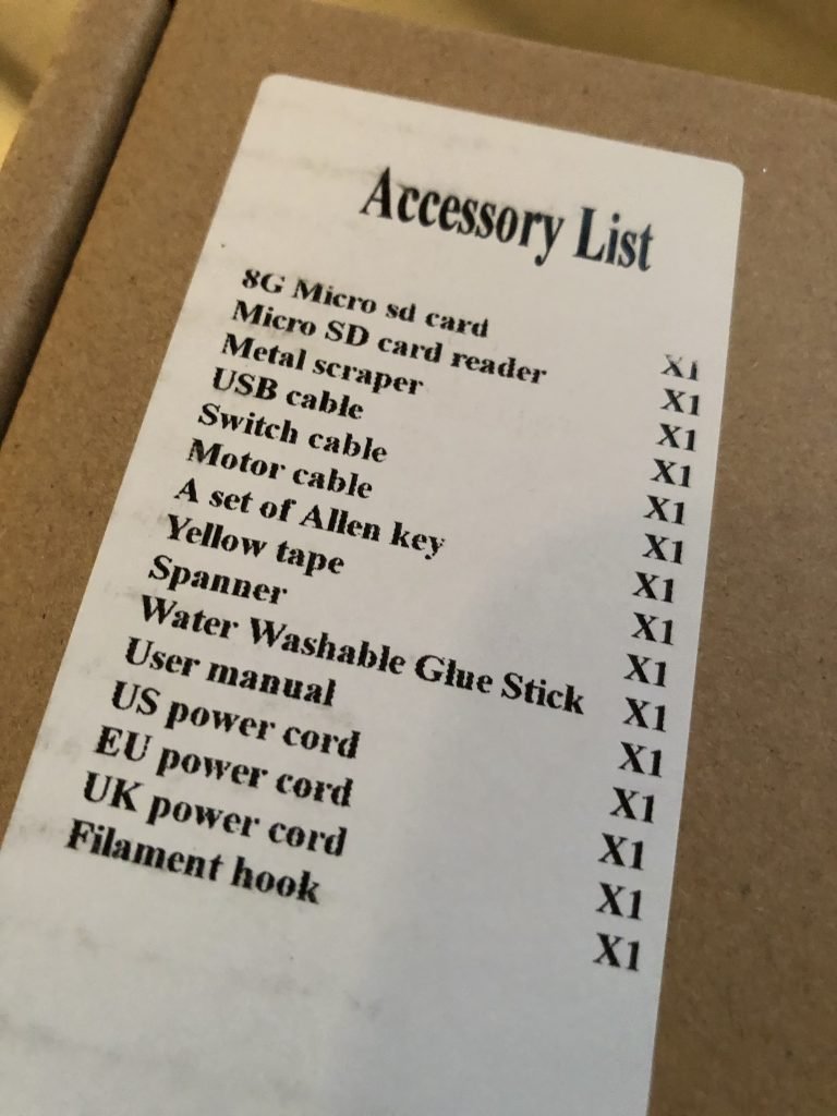 In the box is everything you need, including tape, tools, filament, usb cable for tethered printing, SD card for untethered printing, and even a selection of the main power chords.