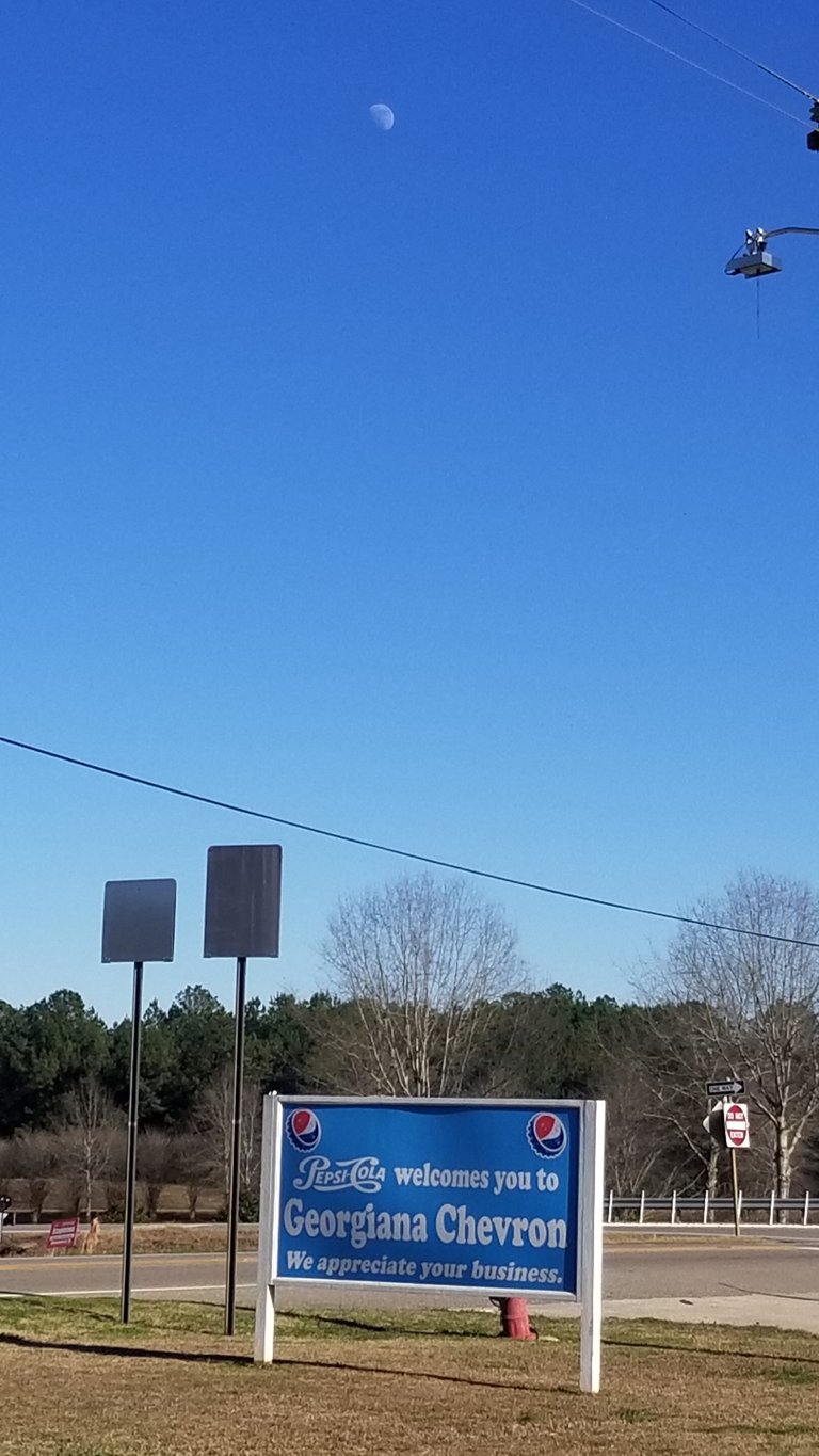 On the road again, and I just had to get this quick snapshot. I love seeing the Moon during the day and I love a band called Georgiana, from Georgiana, Alabama! HA! #KeepMoving