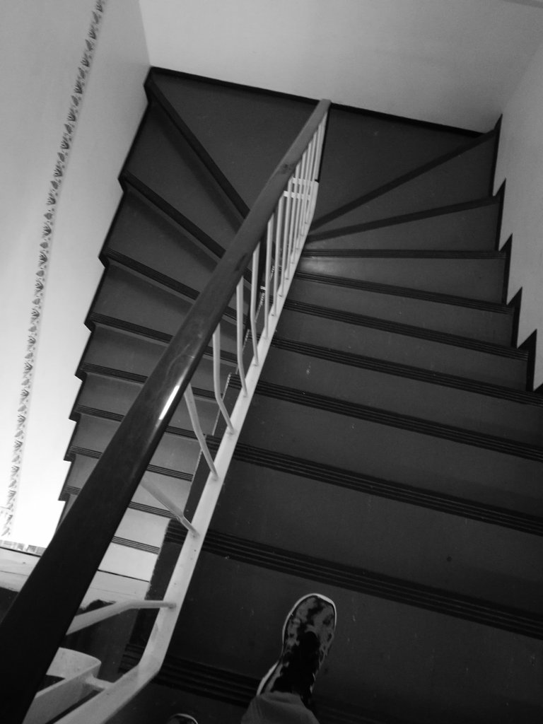 Hopping down the stairs when changing from one class to another. Better be careful, we don't want to break out neck, do we? Why did I start talking like that? I as we? Dunno. Perhaps I wanted to patronize myself. That's always fun.