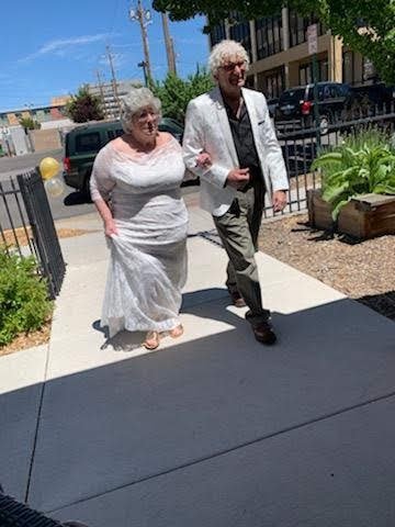 I helped set up the tables & other things the family needed. I talked with everyone & then they arrived. She was in this beautiful white lace dress and he was in this white suit with a black shirt. They looked magnificent.