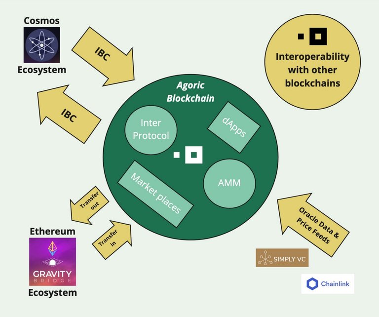 Agoric has meticulously crafted a micro economy that will initially support the blockchain and the dApps and marketplaces that will launch within it. However, this economy is designed with a level of robustness, security, and scalability to expand beyond the borders of its own ecosystem. Built for inter-chain interoperability, the blockchain has all the necessary tools to interact with external protocols and ecosystems (see the picture below).