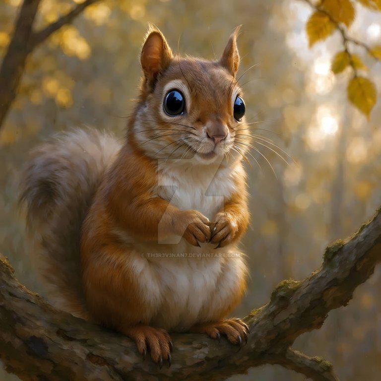 A breathtakingly adorable ultra-realistic digital painting featuring a red squirrel posing perfectly on a tree branch during the magical golden hour. The charismatic little creature sits upright with its tiny paws clasped together in an endearing pose, its enormous sparkling dark eyes gazing directly forward with innocent curiosity. The squirrel's gorgeous russet-orange fur and cream-colored belly are beautifully illuminated by warm, honeyed sunlight that filters through autumn foliage, creating a dreamy bokeh background in rich amber and gold tones. The fluffy tail curves elegantly behind while delicate whiskers catch the golden light. This portrait radiates warmth and charm, capturing the irresistible appeal of these beloved woodland creatures in their most photogenic moment.