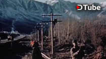 "Summary: AVs, snowcapped mountain peaks and hazardous terrain in Alaska. CUs, animated map of route along highway from Canada to Alaska. CUs, US troops disembarking. Street scenes in Alaskan towns. Seq: Mass of bulldozers at work in snow, rain, and in marshes; building roads and bridges. MSs, MCUs, truck convoy crossing wooden bridges, snow-covered roads, and entering Fairbanks. CUs, sign, "bad ice"; various scenes, trucks skidding on icy roads. Part 2. ARC Identifier 23438 / Local Identifier 111-ADC-9673. Summary: LS, railroad station at Skagway. Camera follows train through mountains showing hazards of ice and snow through which it must pass. VS, Whitehorse, Canada; stores, streets, and people of area. Short scene, US Army engineers attend ceremony at which one enlisted man is presented a medal for heroism in connection with construction of Alaskan highway. Pan, line of persons outside US Government liquor store in Whitehorse. VS, construction crews at work on highway during summer season. Animated map, Whitehorse, Canada to Fairbanks, Alaska showing the Haines cut-off. VS, US Army Engineer Corps at work on construction of cut-off. VS, along river's edge. FS through wooded area to Indian vi1lage. Civilian contractors clear timber, grade and surface roads. All types of construction equipment in operation. AVs, temporary flight strips under construction along highway. VS, Army engineers constructing strips. Ground views, construction of hangars, new runways, and aprons to improve airfields. Planes landing. LS, US Lend Lease planes marked with red star on field. VS, bridges nearing completion. Peace River Bridge which is 2275' long is officially opened in August 1943. Numerous scenes of dedication ceremonies commemorating the opening. Head-on shot, first official cargo to cross the peace River Bridge. VS, vehicles on highway leading from Dawson Creek, Canada to Whitehorse. VS, construction of relay stations along route to service and refuel trucks. AV, Canol Project area which was built as refueling system for vehicles passing over Alaskan highway. US Army engineers spreading dirt over that portion of highway which remains permanently frozen throughout the entire year." US Army film MISC-949 Public domain film from the National Archives, slightly cropped to remove uneven edges, with the aspect ratio corrected, and mild video noise reduction applied. The soundtrack was also processed with volume normalization, noise reduction, and equalization (the resulting sound, though far from perfect, is far less noisy than the original). part 1:
