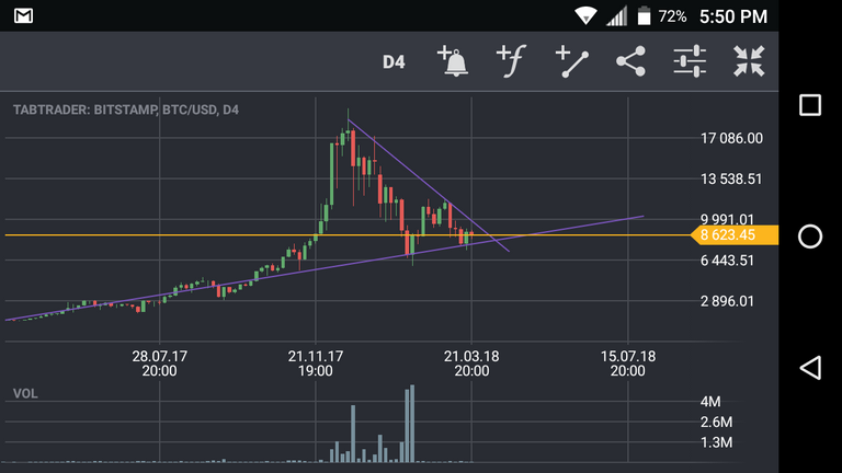We are currently sitting in the main support range($7.75k-$8k) and it's holding for now. This is a time to watch closely, as a break below would signal a continued downtrend. If she holds(I'm thinkin she will) we can expect growth back towards $9k+