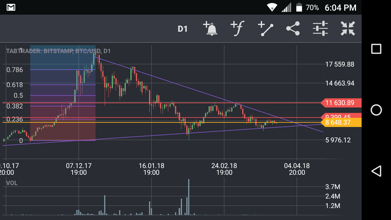 Here I added a rough fib of the climb to $20k. I also added a few red resistance lines for spots the market seems to have, in the past, found resistance/support. You can see they are pretty close to lining up with the fib levels, which supports their importance.