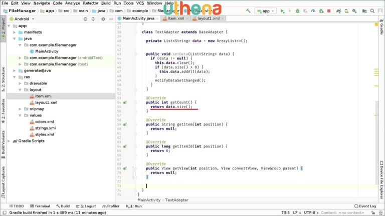The next method is getCount so we will modify it to our needs which will be in our case, return data.size. As simple as that.