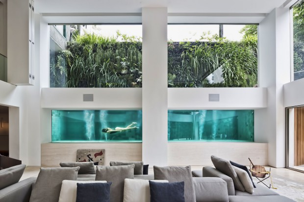 Using extremely thick glass, the architects were able to integrate the pool next to the ground floor lounge. The pool becomes one of the living room walls, swimmers can be seen from inside the house. The pool is accessible from the ground floor and the first floor.
