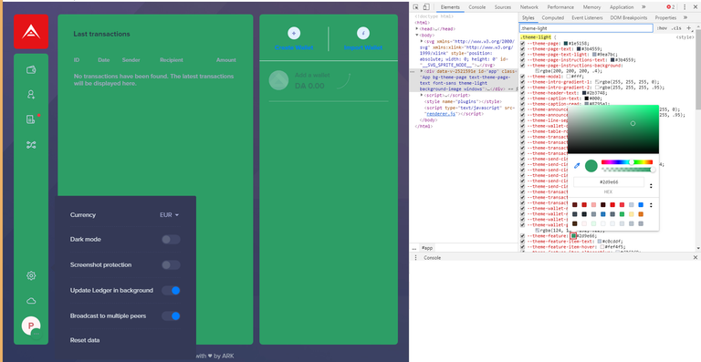 As you can see we edited .theme-plugin-light-mode to what we defined in *index.js, *so we changed it to reflect those changes. In our case, it becomes .theme-plugin-pinky-mode so the index.js file knows what class to read (if we don’t change it here changes won’t come into effect once we publish the plugin). After this is done, let's fire up the ARK Desktop Wallet.