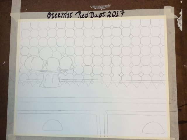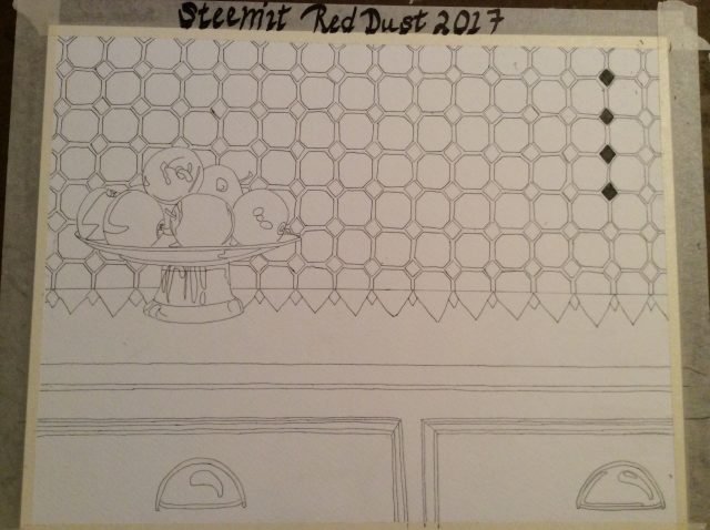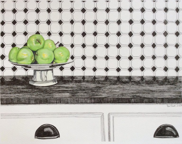 Most of this piece was done with pen and ink, the apples are rendered with watercolor and gouache. I wanted the stark lines with black and white to pop the one color I use in this painting. This is also my favorite way to decorate my kitchen. Dirt can't hide when everything is black and white!