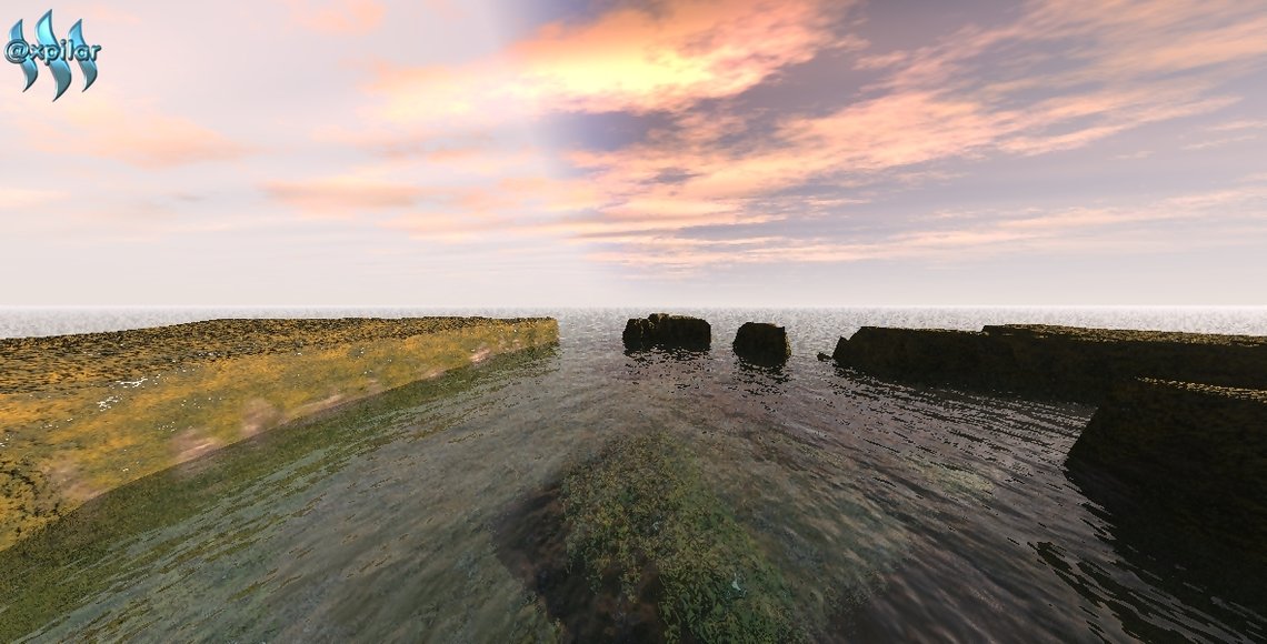 really this image shows a quite quiet place on the planet, seeing it in the first person is like sitting on a natural reef or rocks in the middle and on the surface of the ocean where the water is very quiet and you can see a beautiful blue sky with a cloud that reflects the color of a sun that shines somewhere in the sky.