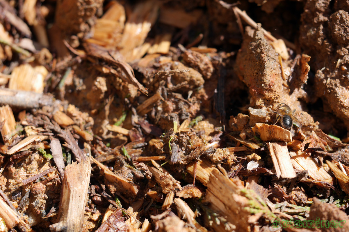 Out of dozens I took, I got one keeper and wanted to share it with the community. The hardwood mulch can be seen around the bee, I use it as long lasting fertilizer. The Mason Bee is off to the right of the picture, its resting on a piece of a wood chip. Its focused on a piece of georgia red clay. The material makes great homes and glad they have such a resource on my property.