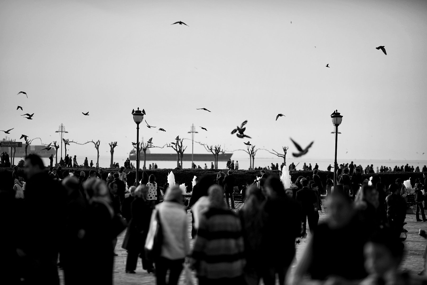 This is a great title for the shot!! A riot of birds and people and yet, one can be lonely still. The black tones around the lady in the white jacket are very nice.