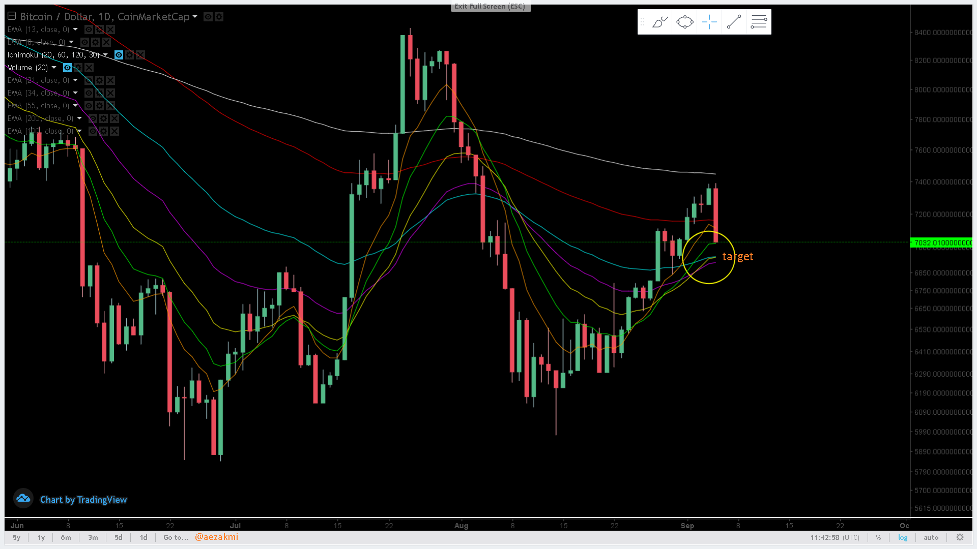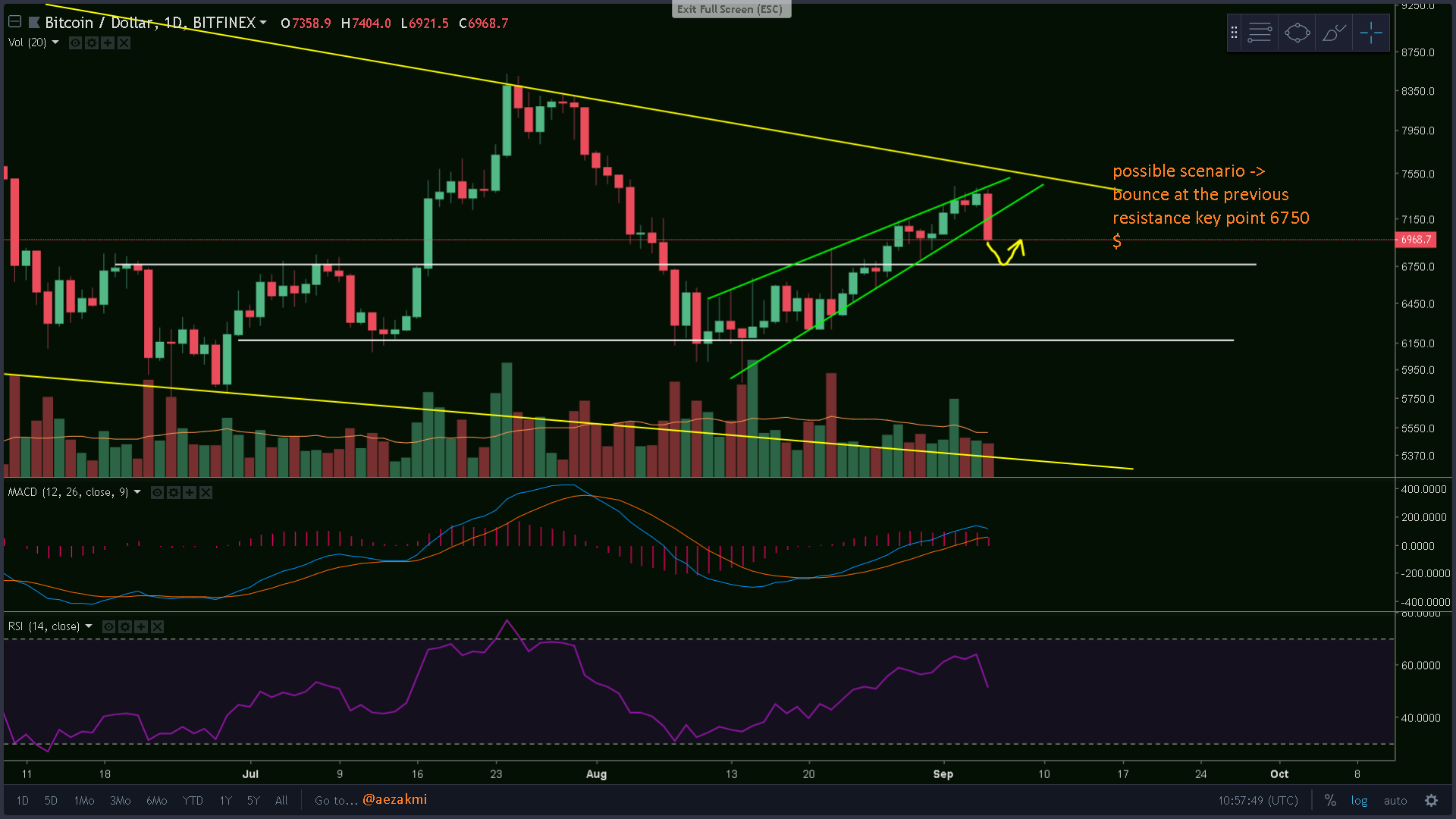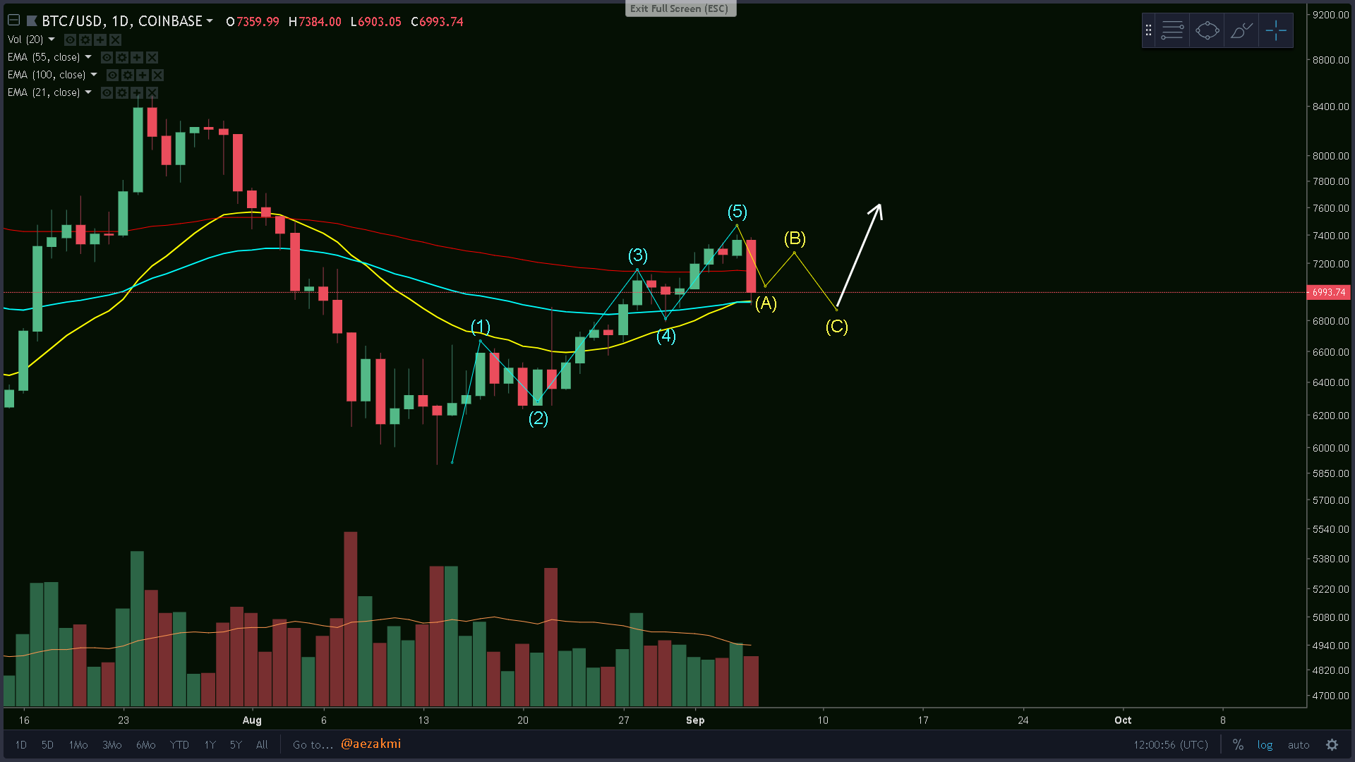 This could also be a short Elliot ABC correction cycle, after the 5 impulse wave pattern. Notice how we immediately stopped at the 21 MA (yellow) and the 55 day MA (blue). If we go like this (ok, maybe not exactly, maybe more extended, but as a ABC correction), then we should be good to go after the end of the C wave, which should not be lower than 6750$.