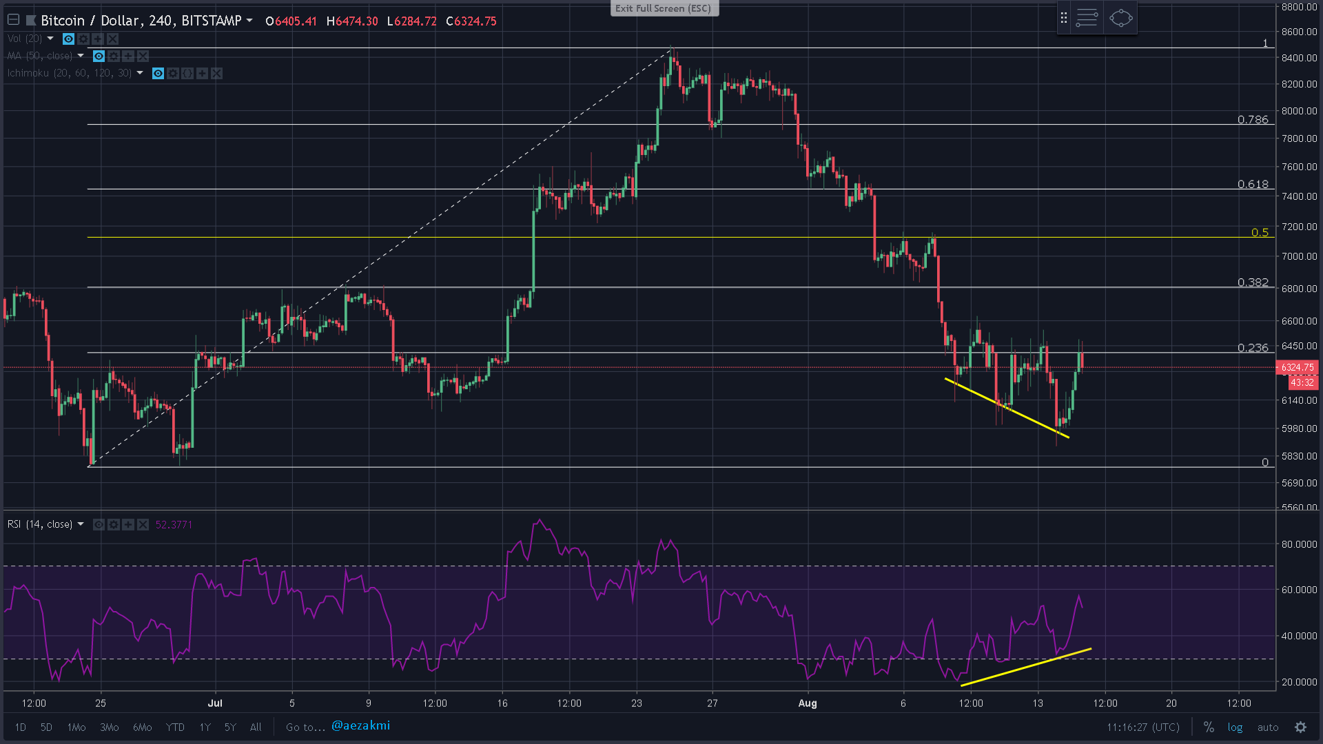 - we found a strong resistance at the 6400$ level, the 0.236 fibonacci retracement from the last run. We had attempts to break it, but didn't succeeded