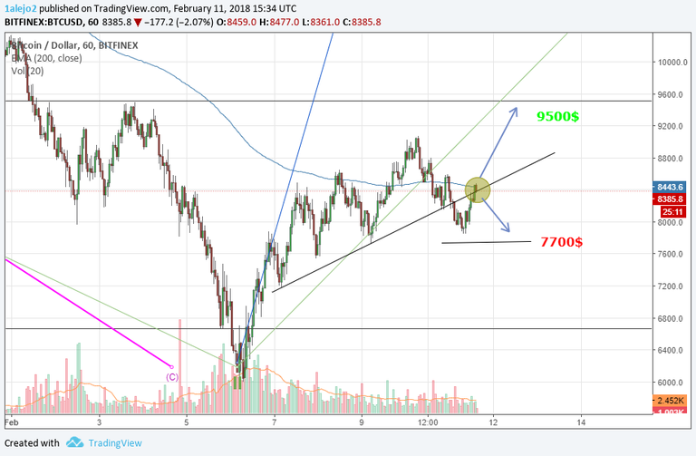 El precio del Bitcoin se encuentra en estos momentos haciendo una doble resistencia, tanto en la linea de tendencia de corto plazo como en la resistencia móvil de la EMA de 200 periodos. De romper ambas resistencias, podríamos esperar que el precio se moviese hacia la próxima resistencia, la cual estaría ubicada aproximadamente a los 9500$. Por el contrario, si el precio no puede vencer estas resistencias, el precio se podría mover hacia los 7700$, donde podría formar el cuello de un posible hombro-cabeza-hombro, el cual nos serviría como soporte.