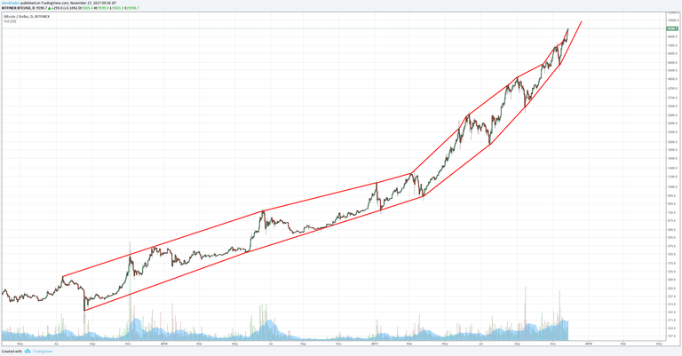 Bitfinex에서 비트코인의 차트를 로그스케일로 변환한 차트다. 위아래로 지붕과 바닥을 그려봤다.