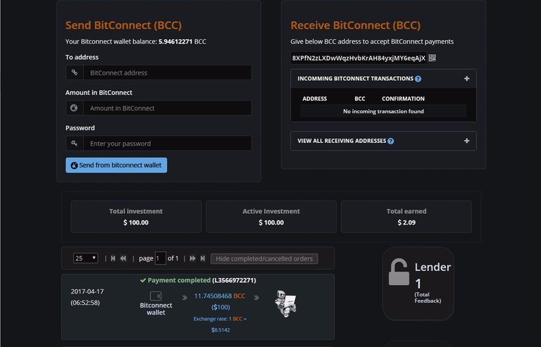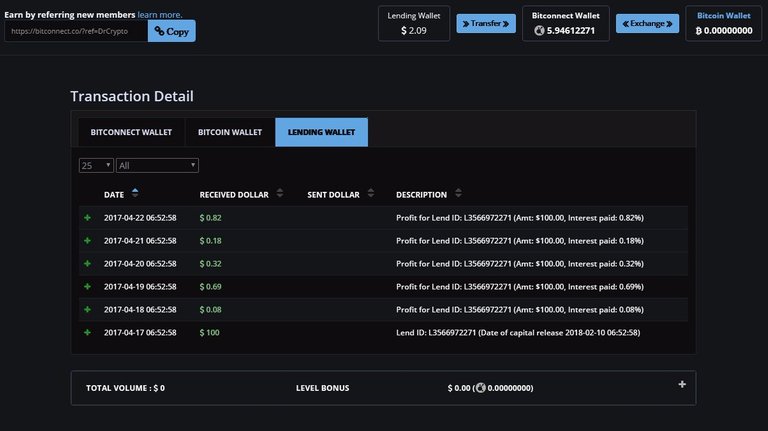 Hola a Todos! Despues de estar prestando $100 en BitConnect por 5 dias, estos son los resultados. El total es $2.09. En la ilustracion de abajo, podran ver el porcentual diaria en detalle. Como ustedes pueden ver, el porcentaje varia diariamente por la razon del sistema de "Trading Bot". El sistema utiliza un programa de Volatilidad de Bitcoin donde el "Bot" gana dinero a como el precio de Bitcoin varia. Entre mas gana el "Bot" mas ganas tu! Diganme si no esta Super Cool? Ah y tambien, todas las ganacias son depositadas a sus carteras Diariamente y disponibles para retirar sin necesidad de esperar que se cumpla el termino del prestamo.