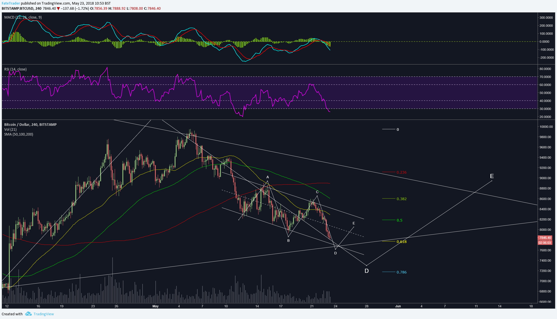 So the price has been trailing right along line I've drawn and now we have nearly reached the major decision point I've wrote on my last post and if we look at the 4 hour chart's RSI, we are nearing to the point when the bounce is imminent. I've drawn on my small bear flag that the E will be somewhere in the middle of this channel and not on top becaus to me it seems like there's little interest in this price level and a lot of people are going to wait for lower/better buying opportunities, we've been at this price level 2 times already and each bounce afterwards was smaller that the previous one so for me it seems that the steam has been exhausted for now but if you want to play this one, please go ahead, you might make some money at a slightly higher risk.