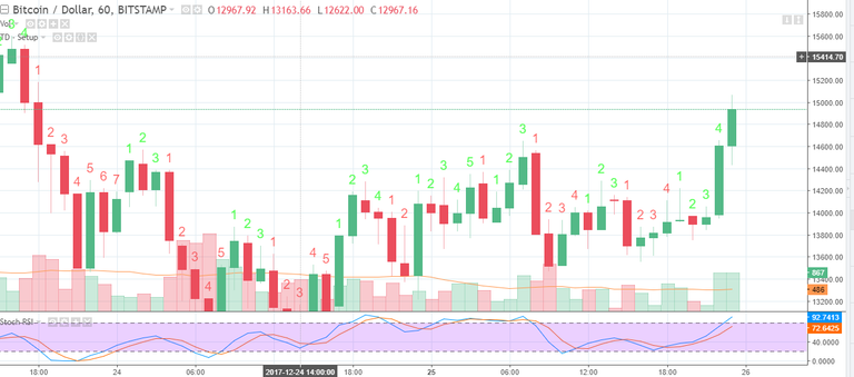 The price of Bitcoin is at $14,915.00 right now, the highest since December 22 and the hourly chart is bullish. The 11 hour closed out higher than the 15 hour candle low.