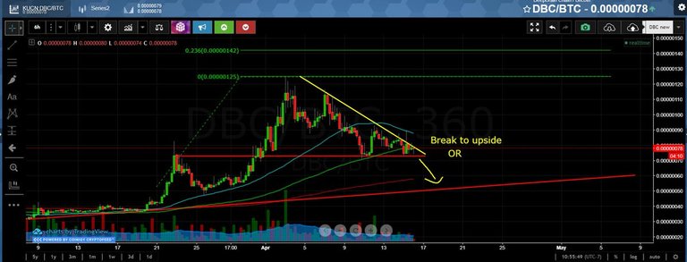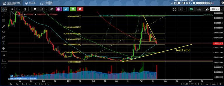 I’m expecting the trend line to be a spot where we’ll see a bounce of about 20%-30%, there’s no way to know if it will turn around completely especially when we haven’t even hit that spot yet. I’ll need to wait and see how the price reacts to the trend line before I can determine whether we’ll be turning around. DBC could easily retest the bottom as it hasn’t really formed a solid bottom, however I believe that the market is being prepped to have an alt coin rally in the month of May which increases the probability that DBC might go for another run. Regardless, whether it turns around completely or not I believe there is a potential for a small profit trade to be had here. All we can do now is to wait and see if it will give us that bounce off the trend line around the 45-55 sat region.