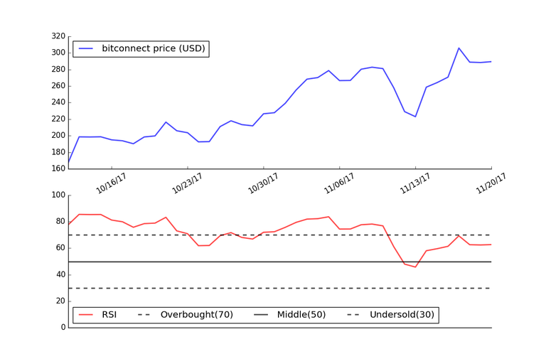 Since the RSI is currently between 30 and 70, this would indicate that Bitconnect is neither overbought or oversold and that no material price change is expected.