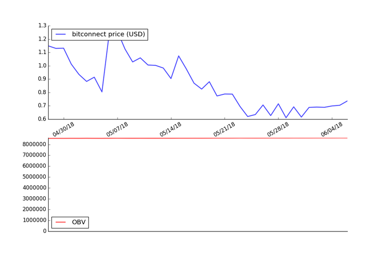 The graph below shows the OBV applied to the price of Bitconnect using daily price data for the last 40 days.