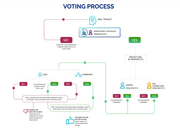 ICO creators or companies will be allowed to submit their project ideas to a panel of project managers within the Bitdepositary platform. Each project will pass through a series of vetting to check for feasibility and many other project viability tests. These testing will involve analysis and evaluation of legal teams and tax consultants among other experts. After the evaluation, the project will be published to the users for voting. The project that will pass the 55% positive minimum will be launched and users can invest in it. Users who participate in voting will receive Project tokens in their Bitdepositary multi-wallet after reaching the softcap of the project.