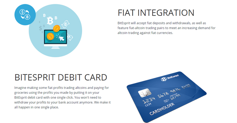 The vision is the elimination of barriers to trade in alternative currencies. To turn this vision into reality, we developed a copying platform to ensure that all emerging companies in cryptom currencies embark on the path to equal opportunity marketing. altcoin-fiat commercial peers are applied to facilitate immediate access to a wide variety of commercial altcoins. To facilitate the investment of fiat's profits, we will allow the purchase of BitEsprit debit cards associated with each user's fiduciary balances. You don't need to go to hundreds of websites to get what you need. BitEsprit is available to meet all your cryptographic needs.