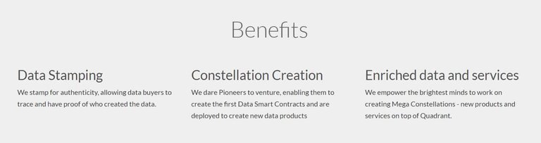 Quadrant means to tackle these issues by giving a diagram to mapping dissimilar information sources. It will bolster verification of information credibility and provenance by means of information stamping, the creation of "Groups of stars" (information keen contracts) for dissimilar information sources, and reasonable compensation and motivator sharing Information Consumers can confide in the genuineness of the information they buy, "Nurseries" (Information Producers) are remunerated genuinely every time their information is utilized, and "Pioneers" (Data Vendors) have the motivation to make imaginative Constellations. This new straightforward biological system guarantees that organizations get the real information they require.