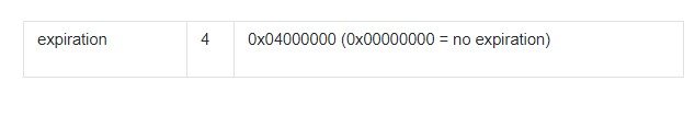 Expiration will also be a new field in the transaction structure. Expiration is the timestamp after which the transaction cannot be included in a block. In other words, if the block timestamp is strictly superior to the transaction expiration timestamp, the block is invalid. Practically, this means that expired transactions will not be forged and will be removed from the transaction pool when they expire, and the transaction will have to be resent again.