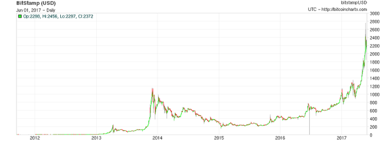 Am 5. Oktober 2009 wurde der erste standardisierte Marktwert vom Bitcoin bei 0,0008 US$ gesetzt, dabei entsprach 1 US$ 1.309,03 Bitcoins (BTC). Aktuell wird der Bitcoin für über 2.300 US$ gehandelt. Das ist fast das 2.900.000fache seines anfänglichen Marktwerts. (3)