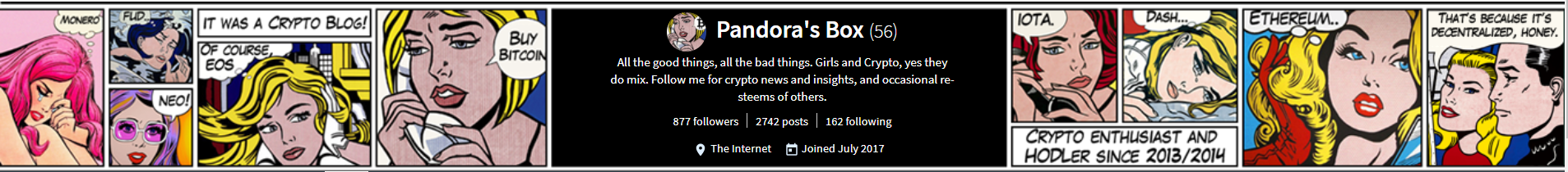 My old cover pic was kind of thrown together, with some HODL memes and a Crypto-Khaleesi but I always liked the Roy Lichtenstein artwork that I use for my profile pic (I added a ₿ to it), so I decided to go with that theme for my new cover pic as well.