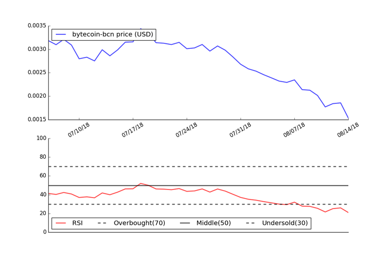Since the RSI is currently below 30, this would indicate that Bytecoin-bcn is becoming oversold and that a price reversal to the upside is expected.