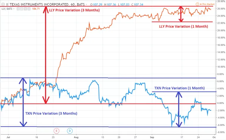 Extending the observation period to last three months (July-to-September) reverses the trend: LLY had much wider range for price swings compared to that of TXN, which is completely different from the earlier observation made over one month. LLY had higher volatility than TXN during the three month period.