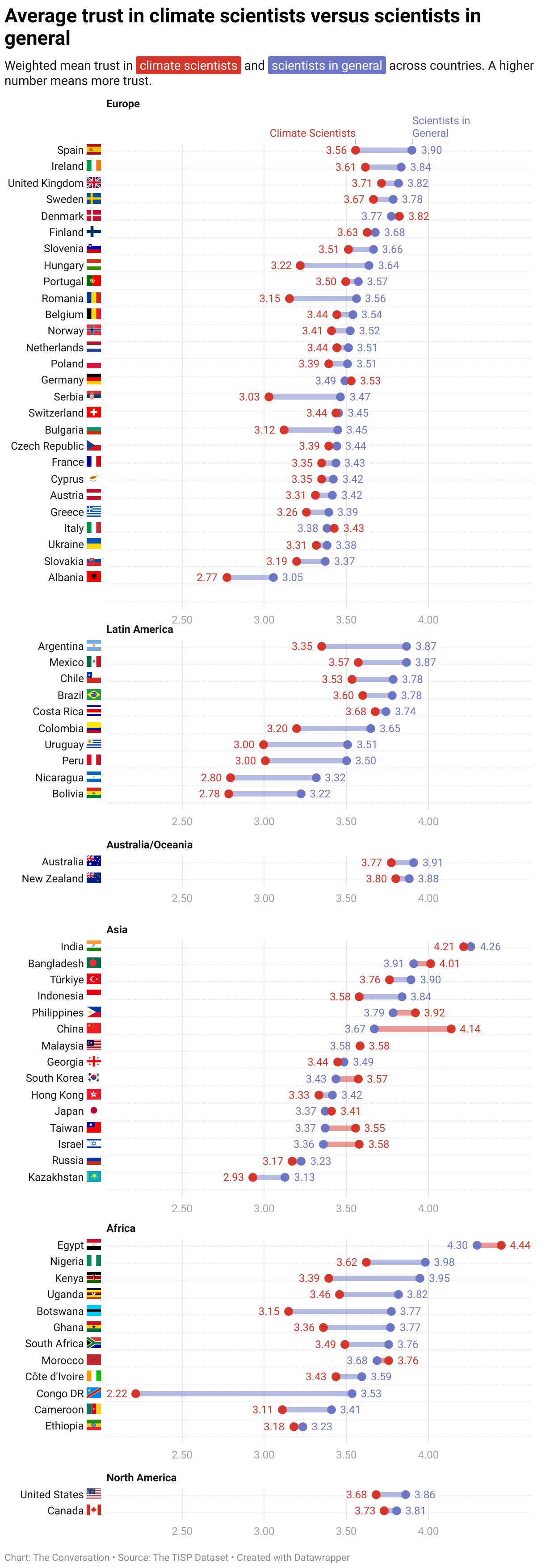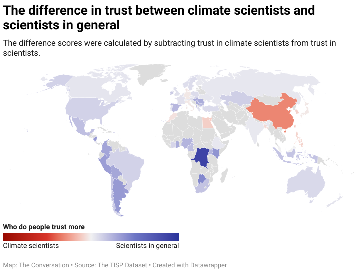 A new global study of nearly 70,000 people in 68 countries reveals that climate scientists are generally trusted less than scientists overall — a difference known as the “trust gap.” This gap varied by region, with smaller differences in North America, Europe, and Oceania, and larger ones in parts of Latin America and Africa.