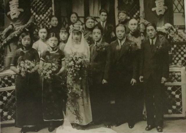民国天津一官僚家庭的婚礼合影此照中新娘身穿旗袍,头戴花冠加披婚纱,除年长者外,新郎、伴郎以及年轻来宾均身着西装,新式婚礼已被愈来愈多的年轻人所接受
