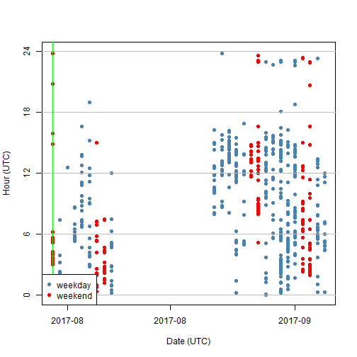 下图是 @mrspointm 的发帖时间图,图里每个点代表一篇帖子,往左水平看对应的是发帖的时刻,往下垂直看是发帖的日期。图中使用的标准时区 UTC。