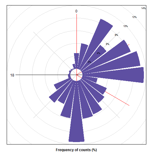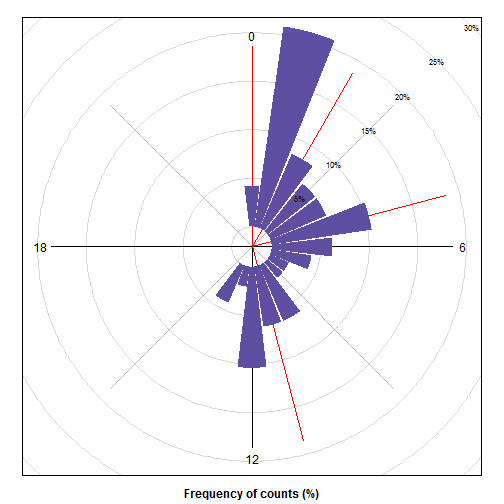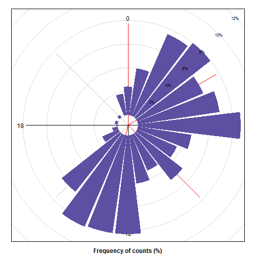 下图是个特殊的时钟,一圈是24小时,显示了 @mrspointm 一天24小时里发帖的频次,面积越大的时段,发帖数就越多。红线显示的是频次分布:每两条相邻红线之间的帖子数,占全部帖子数的 25%。哪两条红线最接近,哪两条红线之间就是 @mrspointm 发帖的高峰时段。主要集中在北京时间9时。居然是早上!