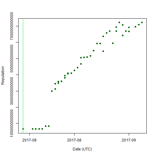 随着朋友数量的变化, @mrspointm 逐渐积累声望。下面是声望值增长的时间趋势。