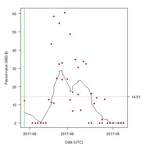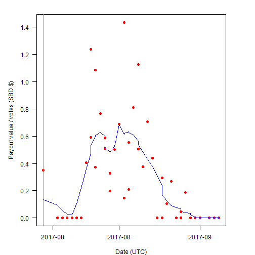 下图是平均每赞得到的收益 SBD 的时间趋势。