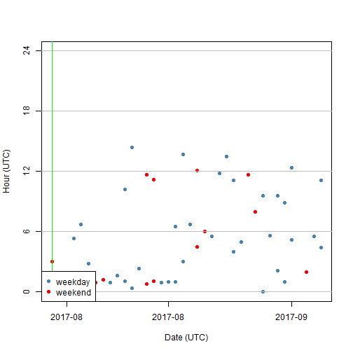 下图是 @mrspointm 对别人帖子的评论(留言)时间图。蓝色点表示周一到周五,红色表示周六和周日。