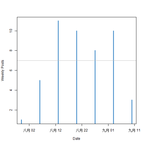 下图是每周累计发帖总数。比较有节制。