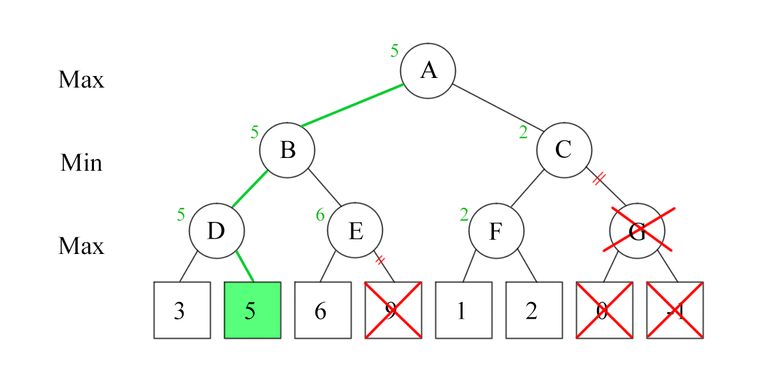 We will definitely need to improve the computational efficiency. Luckily, we can do this via the well-known Alpha-beta pruning, which cuts of quite many sub-trees at early stages (when the depth is small) in advance so we don't need to explore them.