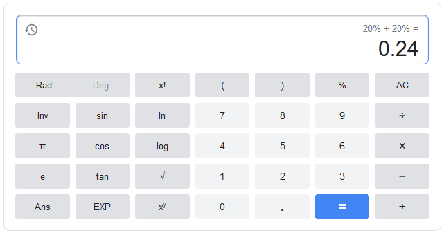 测试了一下,计算器计算的结果不止影响10% + 10%,所有和百分比有关的加减法都受影响,比如说: