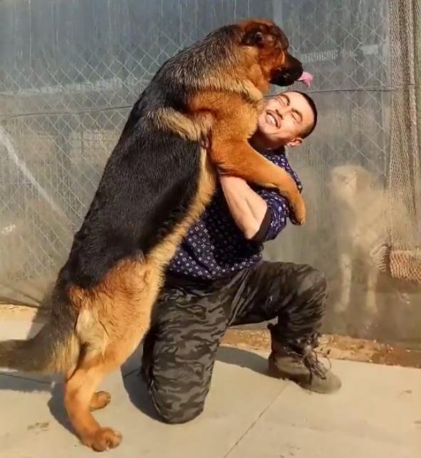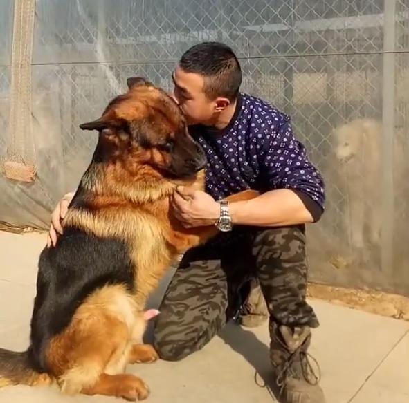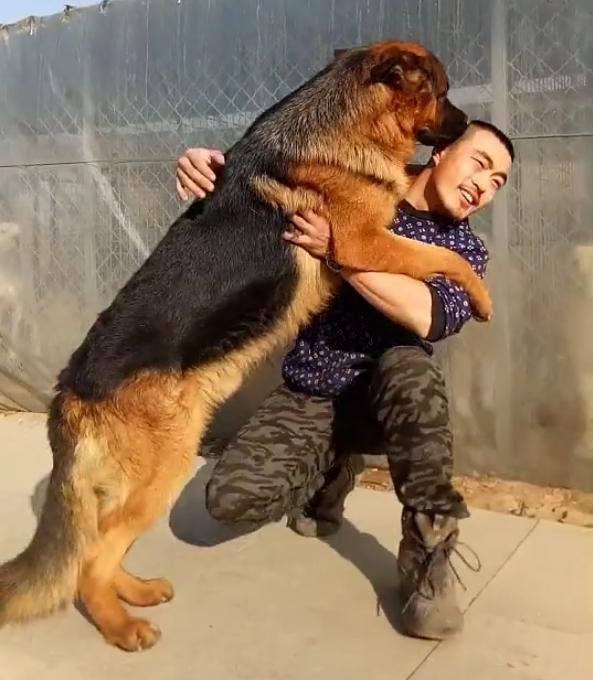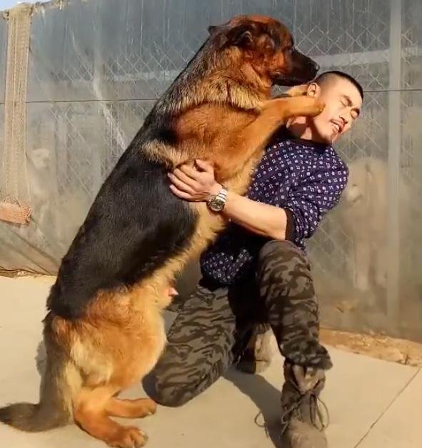 虽说主人也是个一米八几的壮汉,可是面对德牧犬这样的大狗时,还是有点招架不住,推都推不开,还差点就被狗狗给扑倒,然后狗狗呢一边推主人一边伸长了脑袋在主人的头上一顿狂舔,弄的主人满脸都是口水!