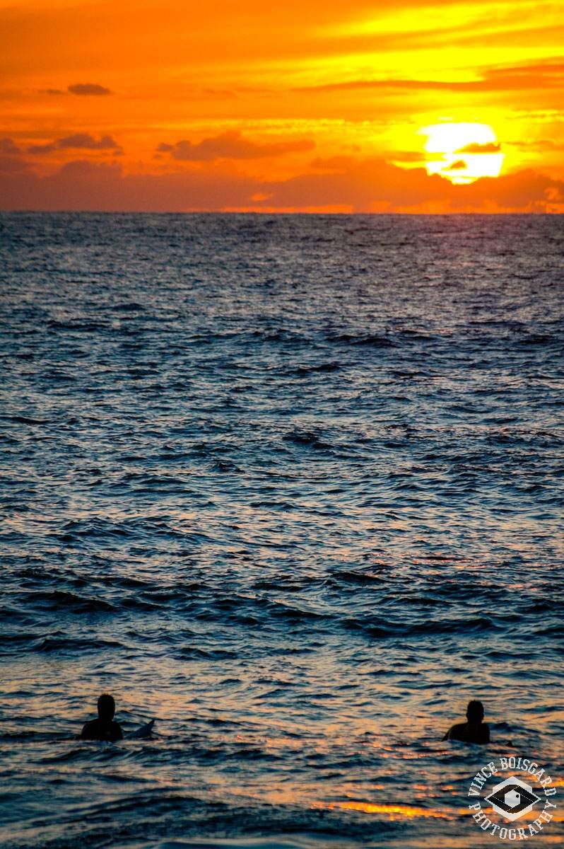 Surfers waiting out in the water for a last wave, hoping for the flat ocean to rise and bring them back on earth for this one last ride before the sunset completely disappear behind the horizon line... A spectacular scenery to keep on dreaming :)