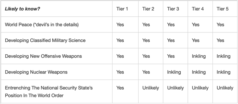 Then below them, there could be Tier 4 Teams (4.A.A.A — 4.A.E.E) who only work on the pure physical, chemical, and biological research. They would have no idea what types of technologies were being actively developed or deployed but might have inklings. They would rarely have any reason or ability to suspect a shift in the world order.