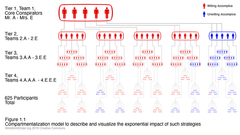 In this model, each team/cell/compartment of five accomplices are all aware of each other, at least as much as needed to collaborate on their compartment’s tasks. So the Tier 1 team of core conspirators are all aware of the plot’s big picture, and any critical details they all need to know.