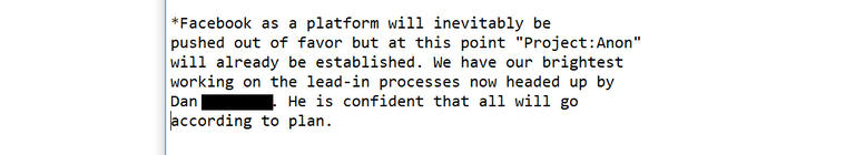 Facebook as a platform will inevitably be pushed out of favor but at this point "Project:Anon" will already be established. We have our brightest working on the lead-in processes now, headed up by Dan [last name redacted]. He is confident that all will go according to plan.