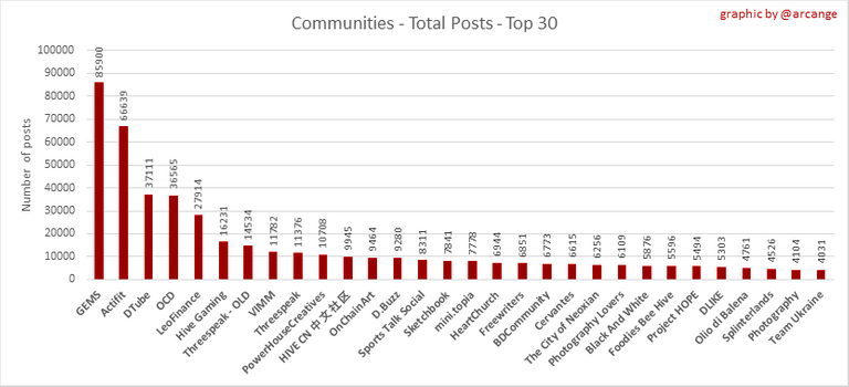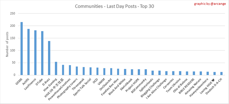 These graphs show the most active communities by number of posts (blockchain lifetime and last day).